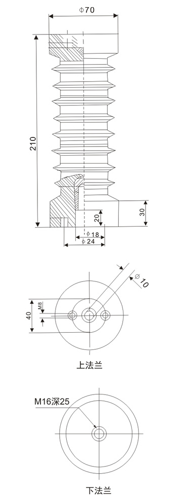 ZJ3-24Q/70×210支柱絕緣子采用環(huán)氧樹脂澆注成型,耐污穢及潮濕,無需特別維護(hù),只需定期清除表面污物,兩端有用于安裝的螺紋孔。
