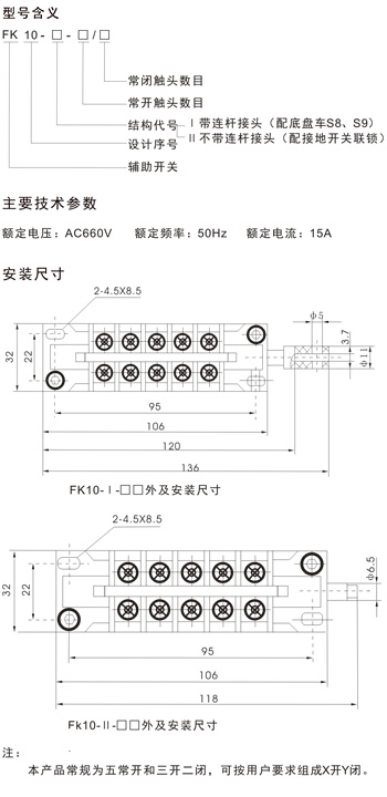FK10系列輔助開(kāi)關(guān)主要用于交流直流真空接觸器的輔助電氣回路中作控制轉(zhuǎn)換電路用,也可在其他電器、電磁開(kāi)關(guān)、接觸器中作為輔助觸頭用。由于該開(kāi)關(guān)的觸點(diǎn)與外界隔離,可在有粉塵的環(huán)境中正常使用。FK10系列輔助開(kāi)關(guān)可定做一組觸點(diǎn)帶延時(shí)。