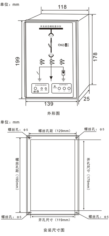 注意:本產(chǎn)品需在柜門上開具尺寸為179±0.5mm橫寬119±0.5mm矩形孔,并在矩形孔的四角開具4個圓孔(孔徑φ5詳見安裝尺寸圖)作為固定本產(chǎn)品用。